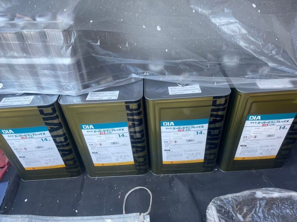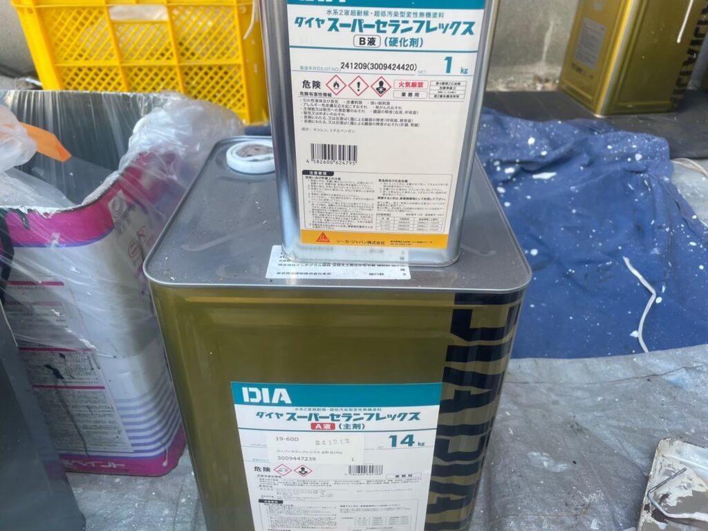 次世代塗料である超耐候性無機塗料『ダイヤスーパーセランフレックス』。ダイヤスーパーセランフレックスはフッ素樹脂塗料をしのぐ無機塗料の中でも、最高の耐候性能を有します。期待耐用年数は24~26年で、紫外線の最も厳しい宮古島での曝露試験結果だけでなく、JIS規格に定めのあるキセノンウェザーメーターという促進耐候性試験を経た結果でもあり、極めて根拠のある年数であります。また、この塗料はダイフレックス社という元祖無機塗料開発メーカーの商品であり、無機含有率を公表している唯一の塗料です。無機含有率の高さが超耐候性を確保します。そして低汚染性はもちろんですが、この塗料は弾力性も兼ね備えた塗料です。現在、耐久性に関していえばこのダイヤスーパーセランフレックスの右に出る塗料は無いといっても過言ではありません。