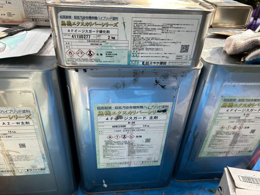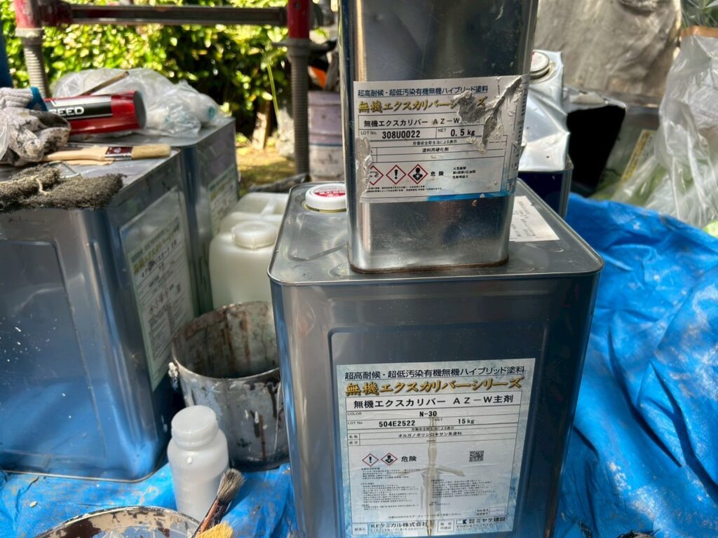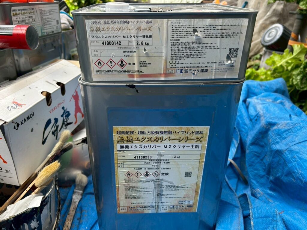 | 使用商材・建材 | 外壁:無機エクスカリバーAZ-W(2液型水性/超低汚染無機塗料/KFケミカル) 外壁:無機エクスカリバーMZクリヤー(2液型弱溶剤/超低汚染無機塗料/KFケミカル) 屋根 : スーパーガルテクト(ガルバリウム鋼板カバー工法/アイジー工業) 付帯 : 4フッ化フッ素(2液型弱溶剤/フッ素塗料) 開口部 : オートンイクシード(超高耐久・高耐候シーリング材/オート化学工業) |