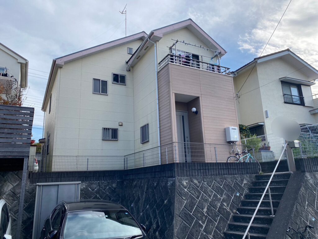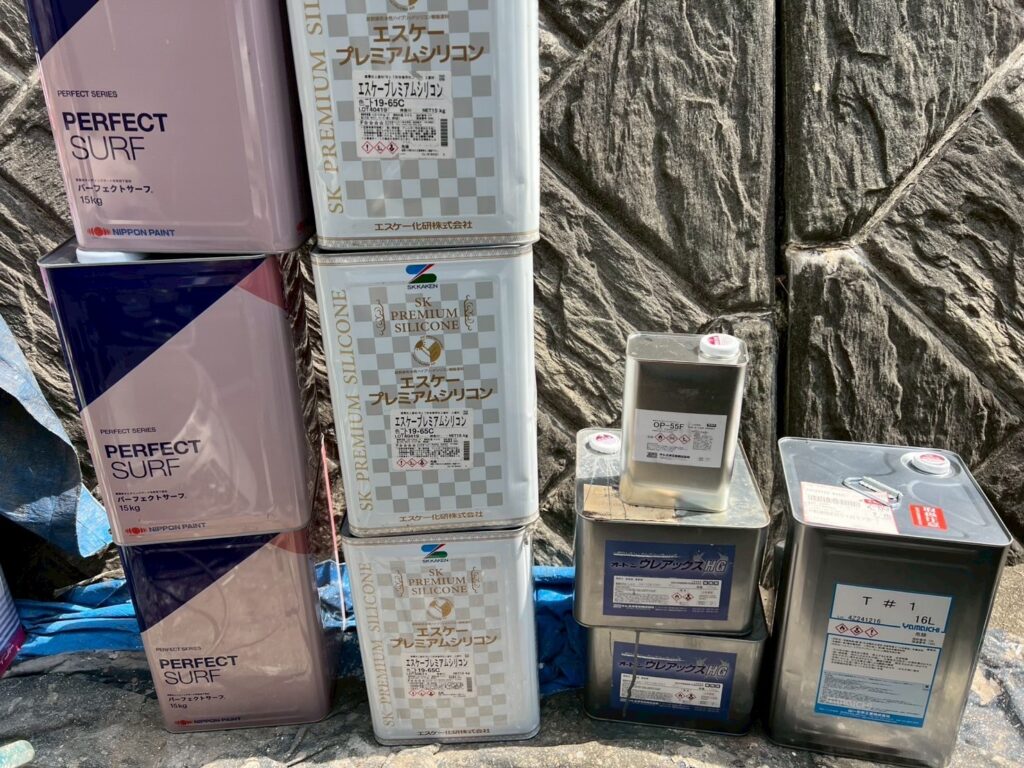| 使用商材・建材 | 外壁:エスケープレミアムシリコン(1液型水性/シリコン塗料/エスケー化研) 屋根 : エスケープレミアムルーフSi(2液型弱溶剤/シリコン塗料/エスケー化研) 付帯 : ファインSi(2液型弱溶剤/シリコン塗料) 目地/開口部 : オートンイクシード(超高耐久・高耐候シーリング材/オート化学工業) |