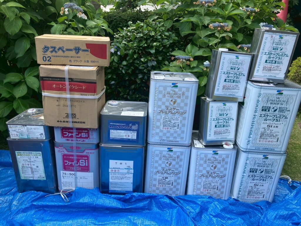 | 使用商材・建材 | 外壁:エスケープレミアムシリコン(1液型水性/シリコン塗料/エスケー化研) 屋根 : エスケープレミアムルーフSi(2液型弱溶剤/シリコン塗料/エスケー化研) 付帯 : ファインSi(2液型弱溶剤/シリコン塗料) 開口部 : オートンイクシード(超高耐久・高耐候シーリング材/オート化学工業) |