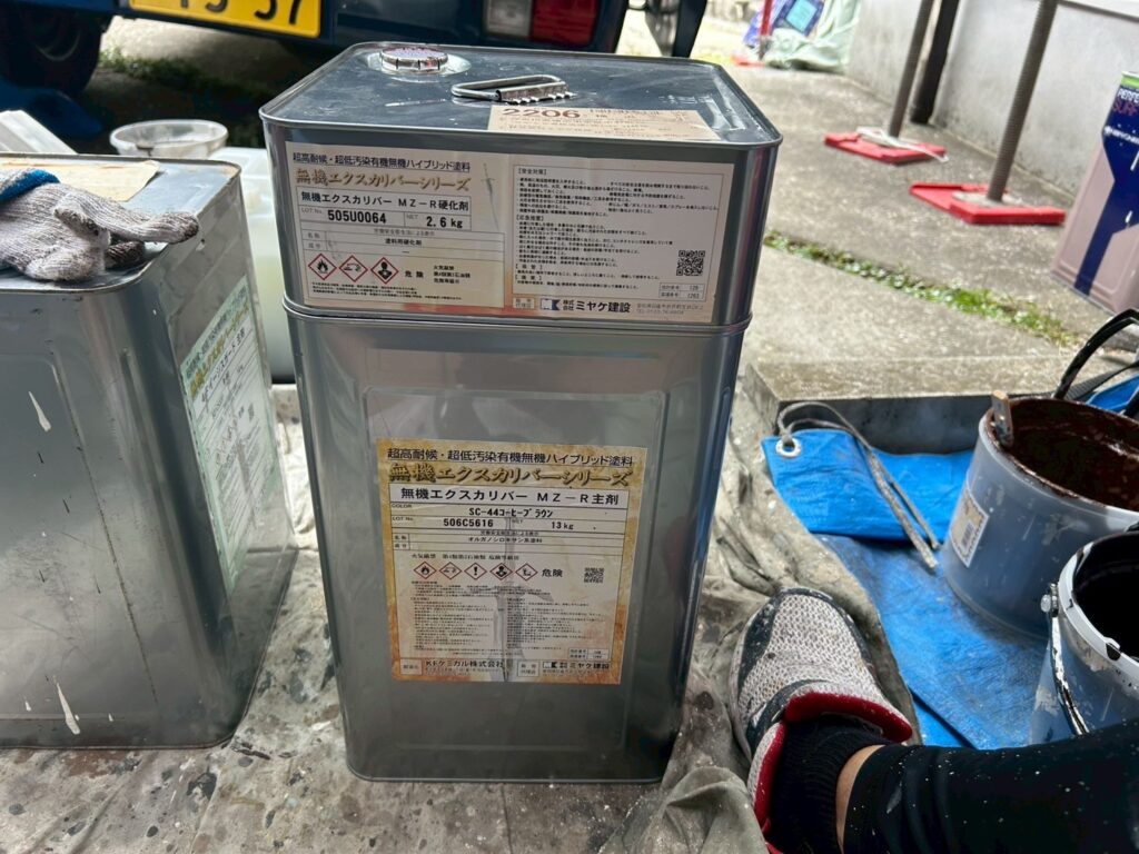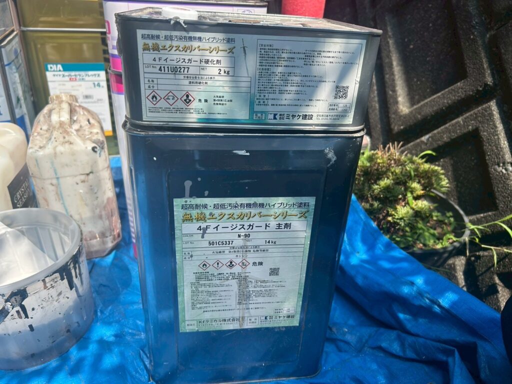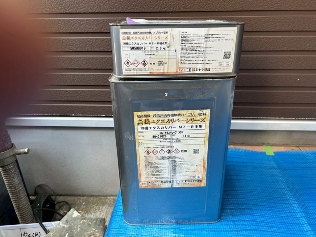 | 使用商材・建材 | 外壁:ダイヤスーパーセランフレックス(2液型水性/無機塗料/シーカジャパン) 屋根 : 無機エクスカリバーMZ-R(2液型弱溶剤/無機塗料/KFケミカル) 付帯 : 4フッ化フッ素(2液型弱溶剤/フッ素塗料) 目地/開口部 : オートンイクシード(超高耐久・高耐候シーリング材/オート化学工業) |