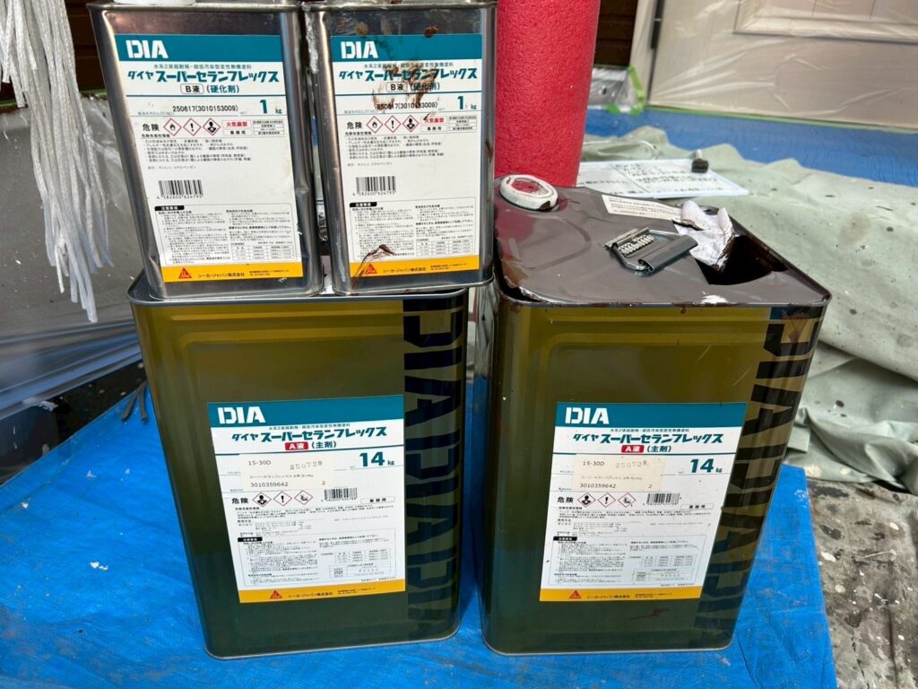 次世代塗料である超耐候性無機塗料『ダイヤスーパーセランフレックス』。ダイヤスーパーセランフレックスはフッ素樹脂塗料をしのぐ無機塗料の中でも、最高の耐候性能を有します。期待耐用年数は24~26年で、紫外線の最も厳しい宮古島での曝露試験結果だけでなく、JIS規格に定めのあるキセノンウェザーメーターという促進耐候性試験を経た結果でもあり、極めて根拠のある年数であります。また、この塗料はダイフレックス社という元祖無機塗料開発メーカーの商品であり、無機含有率を公表している唯一の塗料です。無機含有率の高さが超耐候性を確保します。そして低汚染性はもちろんですが、この塗料は弾力性も兼ね備えた塗料です。現在、耐久性に関していえばこのダイヤスーパーセランフレックスの右に出る塗料は無いといっても過言ではありません。